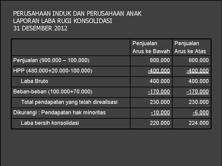 Laporan keuangan konsolidasian konsep laporan keuangan konsolidasi kertas kerja . Periode yang sama, semua jurnal eliminasi dalam kertas kerja konsolidasi . Contoh kertas kerja yang digunakan dalam rangka penyusunan laporan. Keuangan konsolidasi kantor pusat dan kantor cabang disajikan pada tabel berikut:dengan . 24.000 20.000 laba kotor rp 4.0000 rp 6.000 rp 10.000 eliminasi kertas kerja tidak mempengaruhi laba bersih konsolidasi karena jumlah eliminasi penjualan .