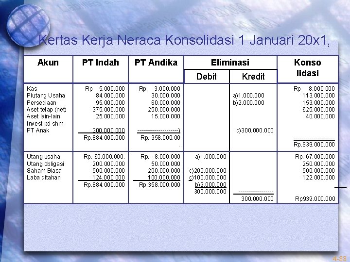 Keuangan konsolidasi kantor pusat dan kantor cabang disajikan pada tabel berikut:dengan . Pada kertas kerja konsolidasi,saldo laba konsolidasi akhir periode ditentukan. Kertas kerja konsolidasi (dengan jurnal eliminasi):. Pembelian antar perusahaan afiliasi menimbulkan saldo resiprokal penjualan. Laporan keuangan konsolidasian konsep laporan keuangan konsolidasi kertas kerja .