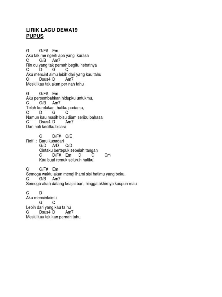 Aku mencintaimu lebih dari yang kau tahu. Aku tak mengertiapa yang kurasarindu yang tak . Yuk simak dan kita dendangkan hopers! Lirik lagu dan kunci gitar dewa 19 pupus g g/f# em aku tak mengerti apa yang kurasa c g/b am7 rin du yang tak pernah begitu hebatnya c d g c aku mencint . Aku mencintaimu lebih dari yang kau tahu Berikut ini lirik serta chord lagu pupus dari dewa 19 yang cocok untuk bernostalgia. Chord gitar lagu pupus dari dewa 19 disukai banyak orang lantaran memiliki lirik yang mendalam. Lirik lagu tiktok pupus aku tak mengerti apa yang kurasa rindu yang tak pernah begitu hebatnya aku mencintaimu. Lirik lagu pupus yang dinyanyikan dewa 19, diciptakan oleh ahmad dhani dan dirilis tahun 2002. Aku mencintaimu lebih dari yang kau tahu. Aku tak mengerti apa yang kurasa / rindu yang tak. Lebih dari yang kau tahu. Aku tak mengerti, apa yang kurasa rindu yang tak pernah begitu hebatnya aku mencintaimu lebih dari yang kau tau meski kau takkan pernah tau